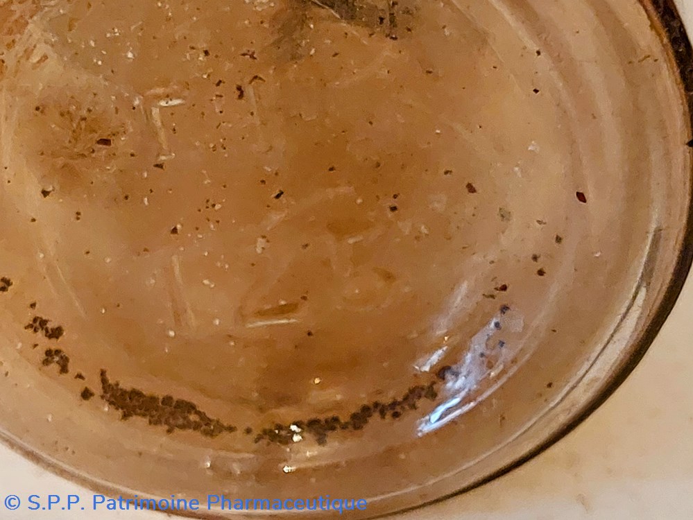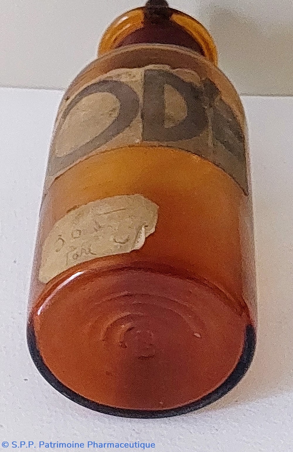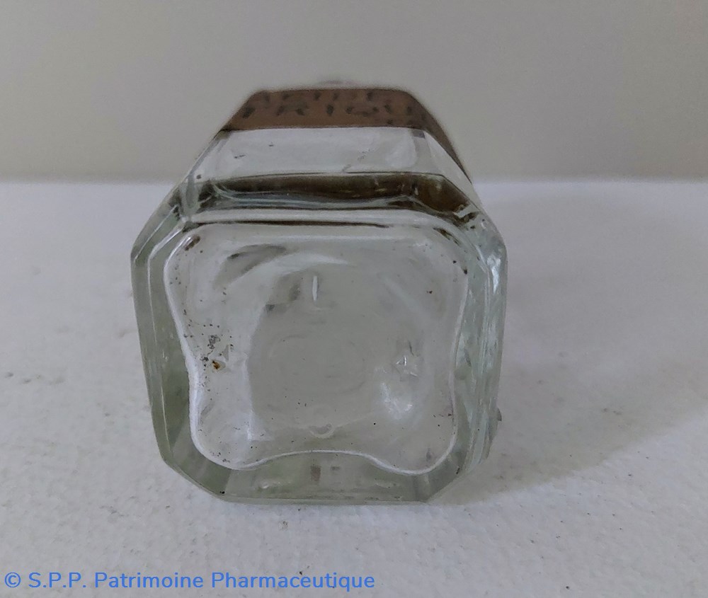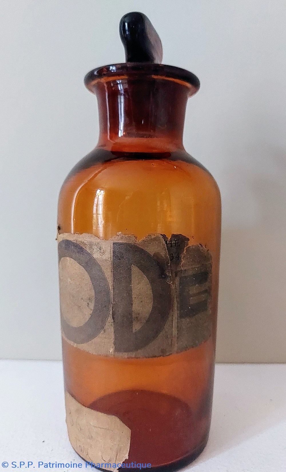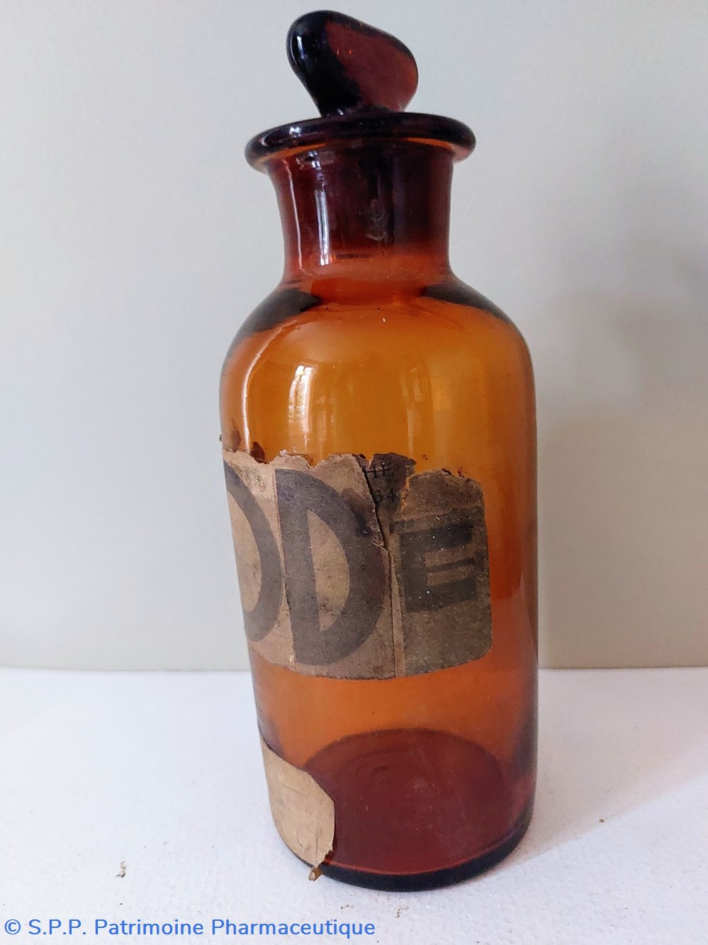 Flacon vide en verre ambré portant une étiquette grossièrement manuscrite " IODE"