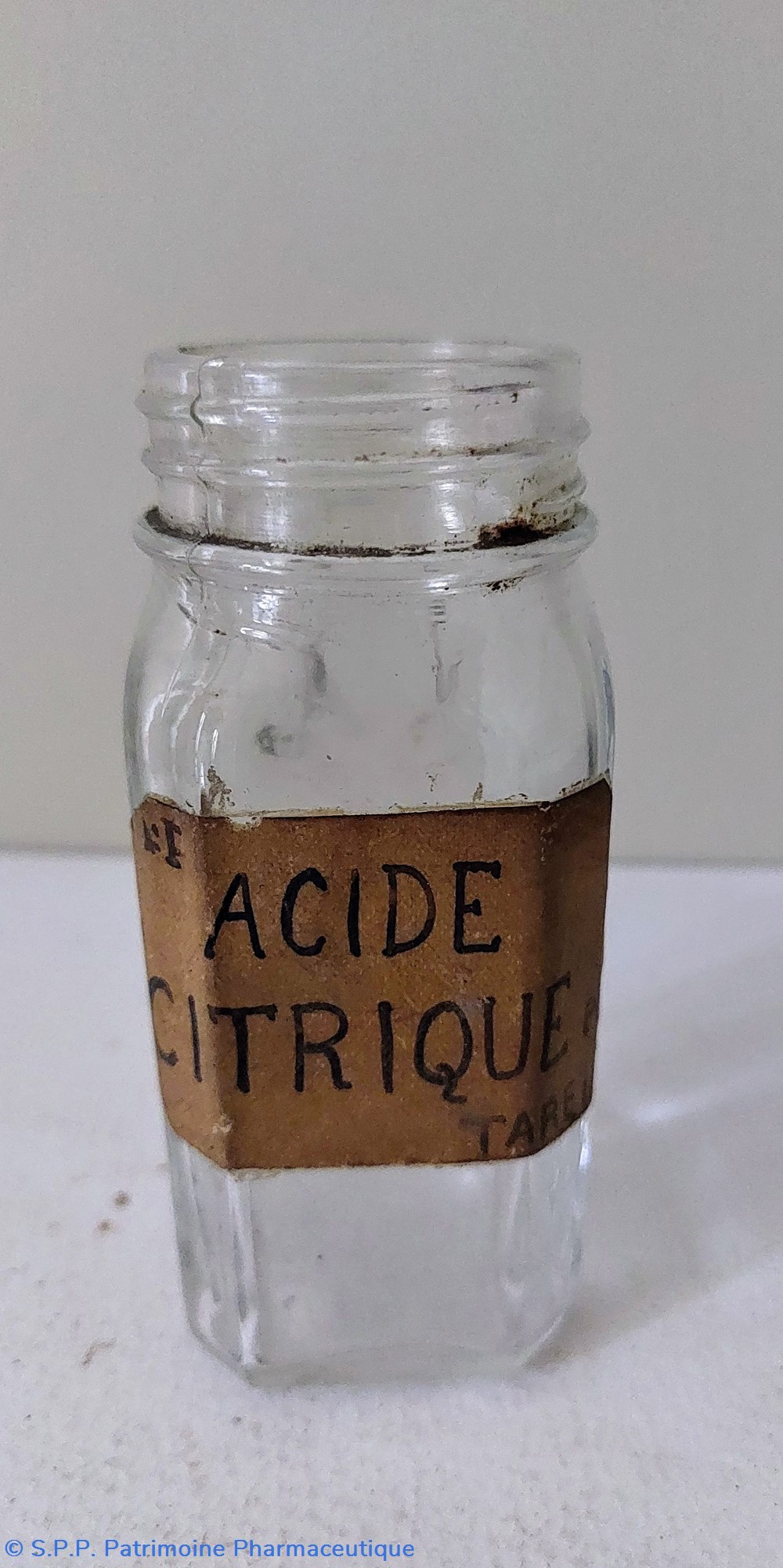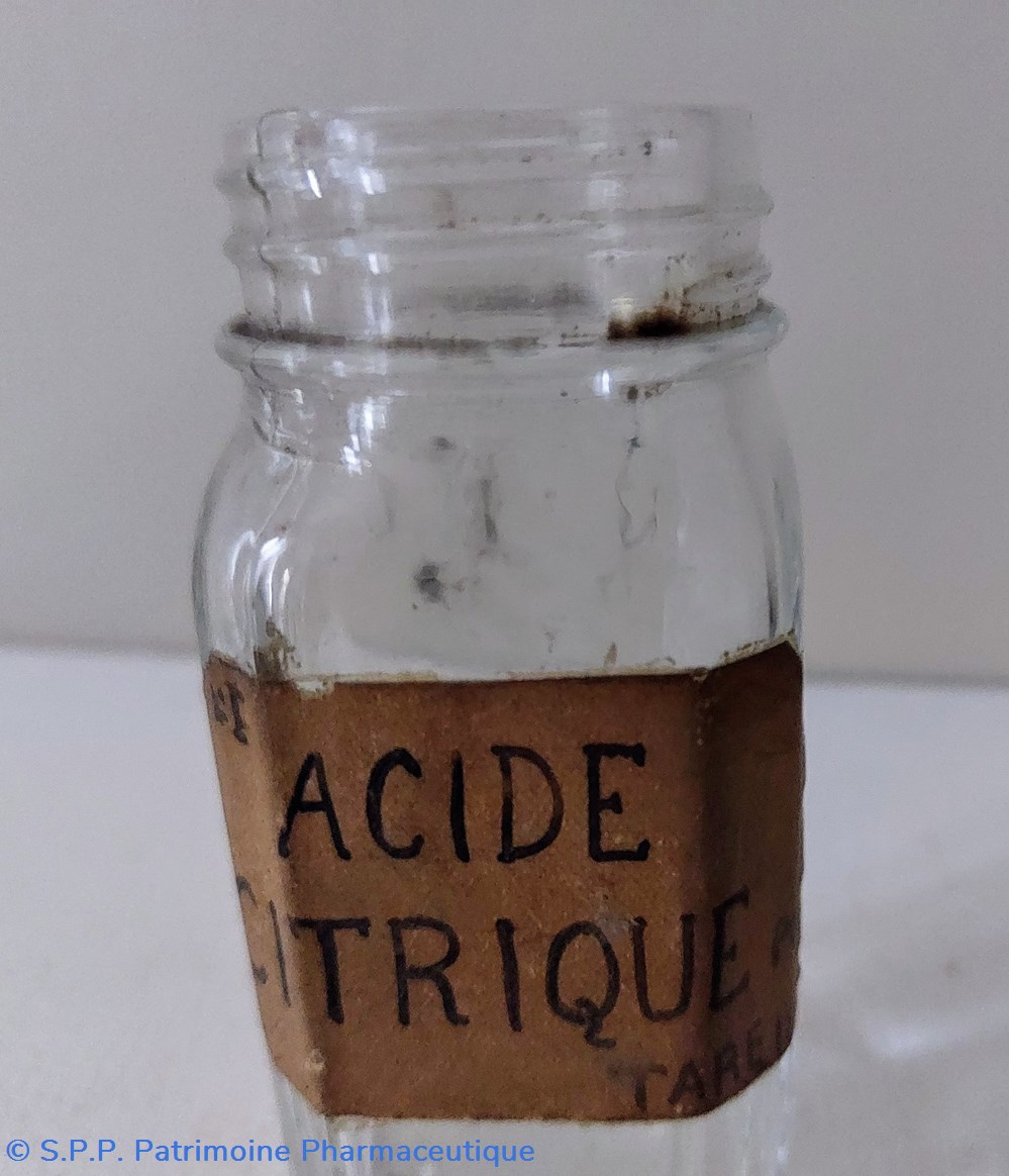 Flacon vide en verre incolore portant une étiquette manuscrite "Acide Citrique"