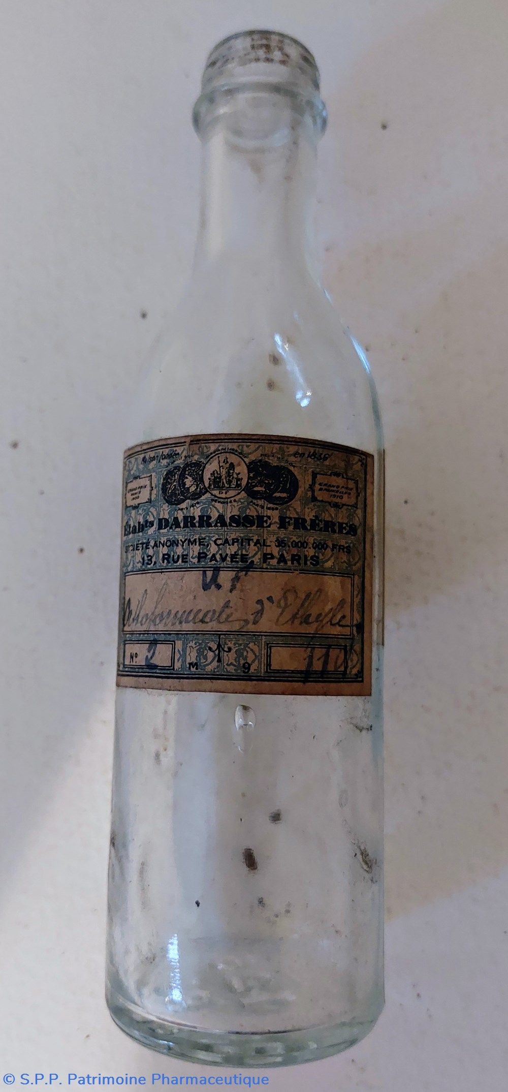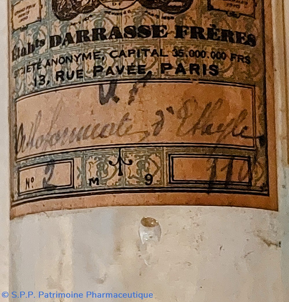 Une étiquette des Établissements DARRASSE FRÉRES à Paris indique "Orthoformiate d'ethyle"