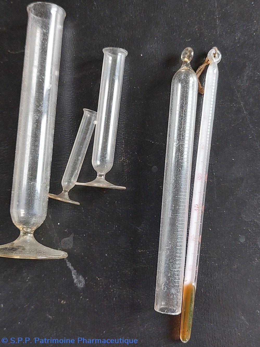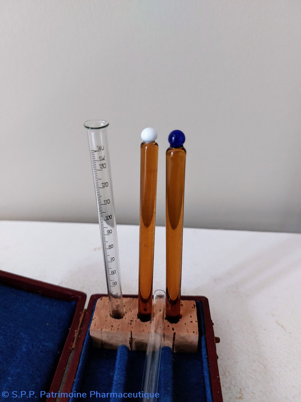 Une pipette en verre. Deux tubes de verre scellés différenciés par une boule de couleur et Un tube de verre gradué de 10 à 140. et le repaire 135 est marqué SW.