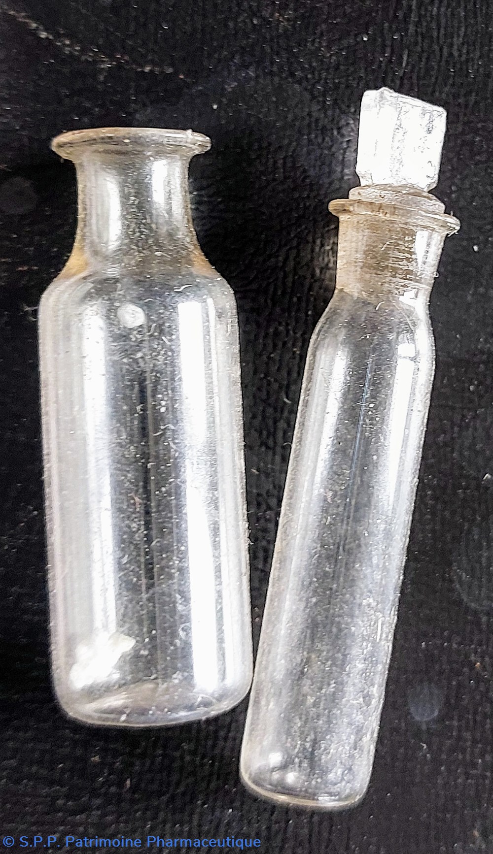 Deux petites fioles une haute de 4 cm et '' autre de 5 cm avec son bouchon.