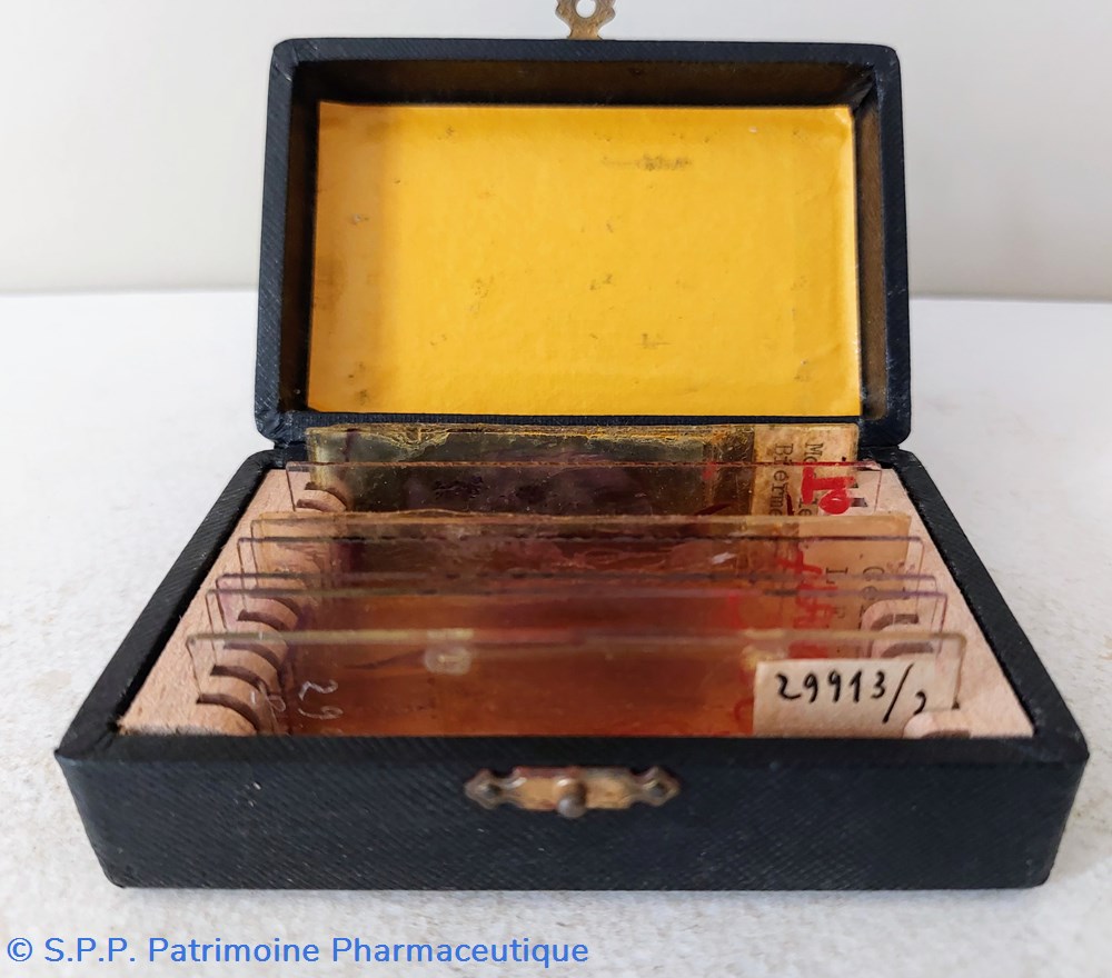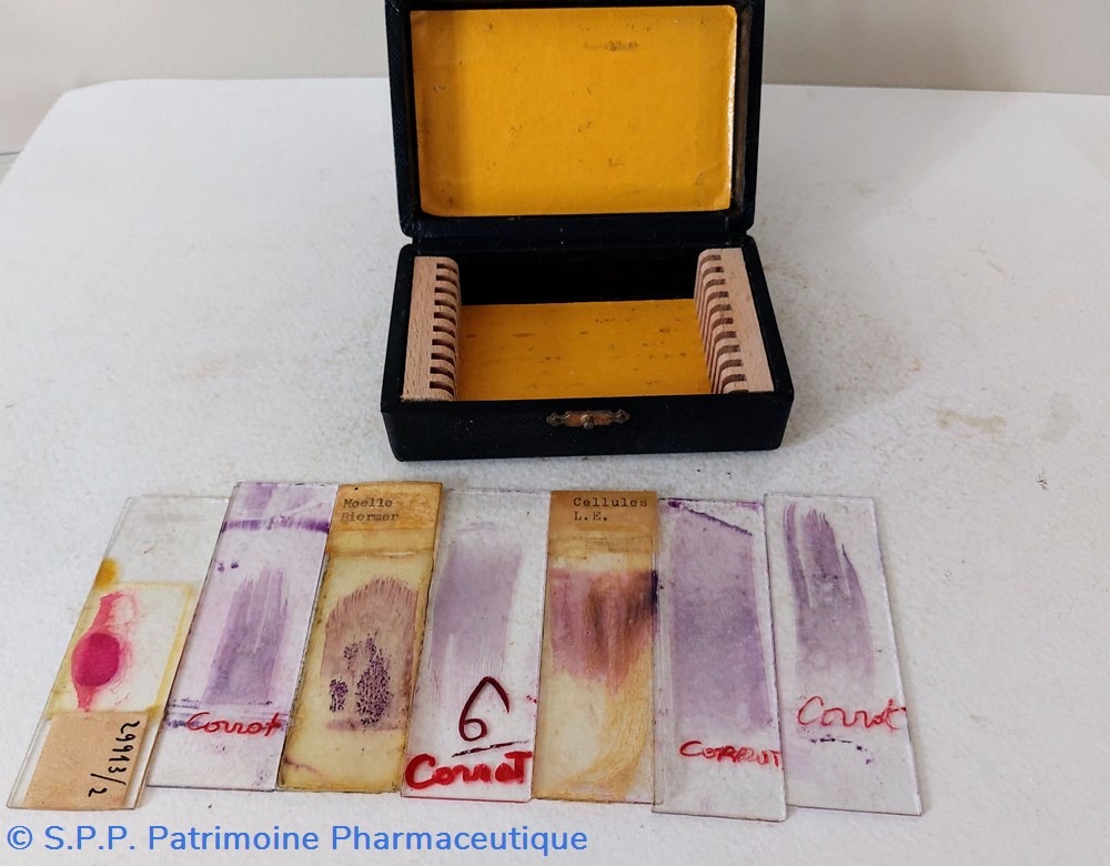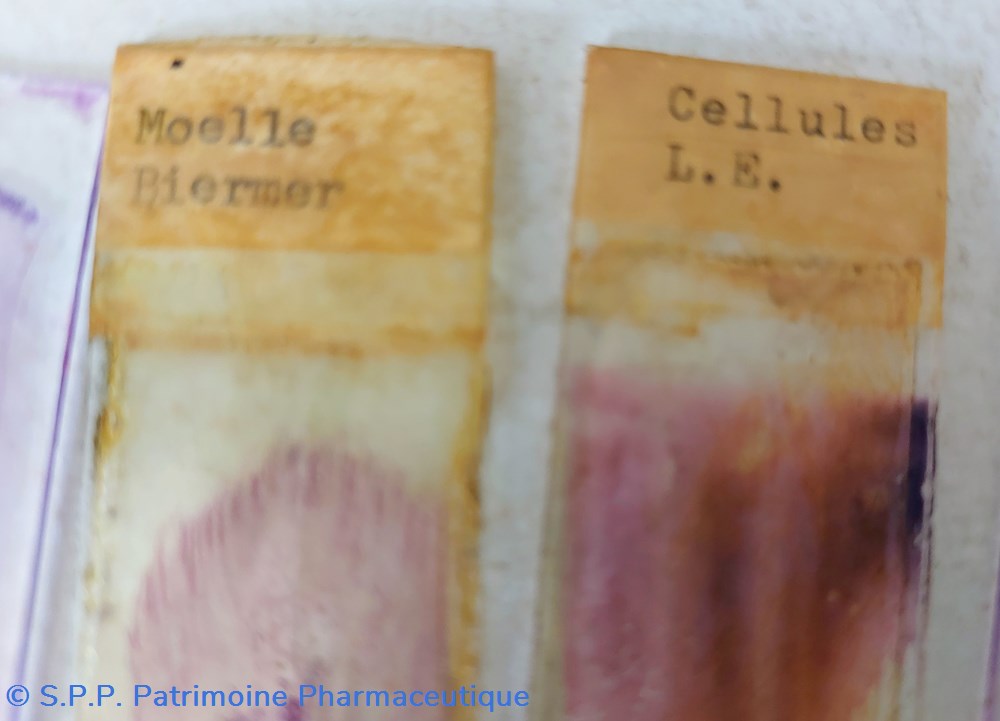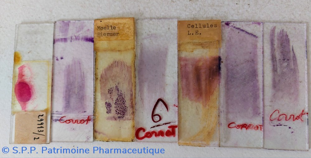 Il semble que ce soit des lames préparées pour microscope. Deux sont identifiées " Moelle Biermer" et l'autre " Cellules L. E."