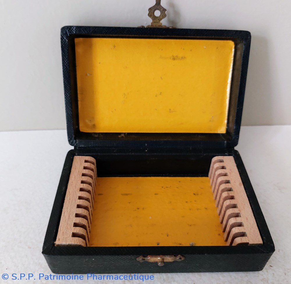 Coffret de lames de microscope dans un étui comprenant 10 rangements de lames de verre.