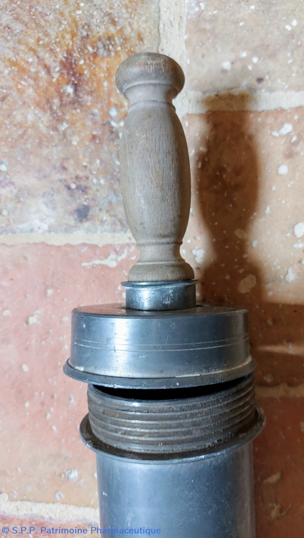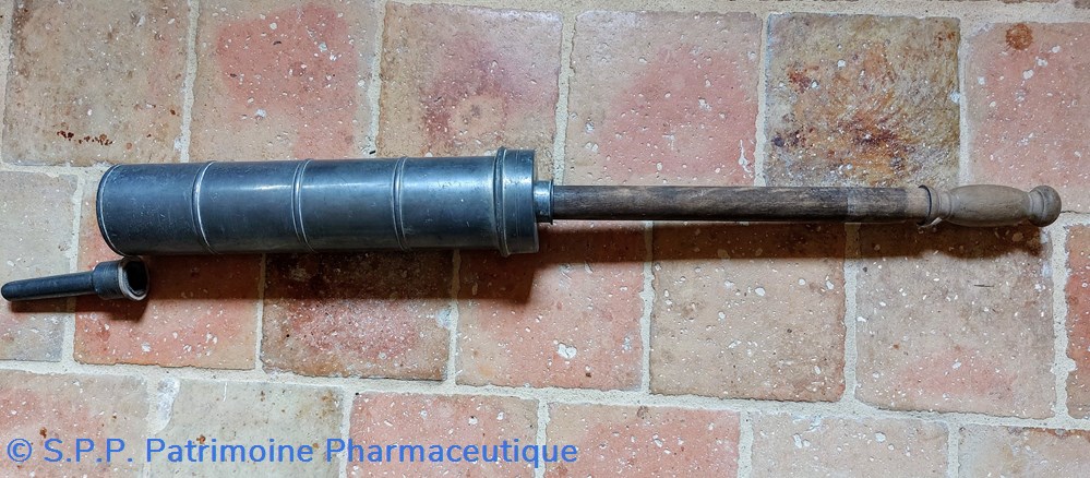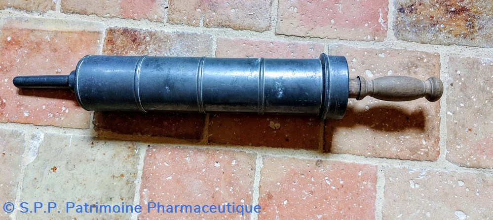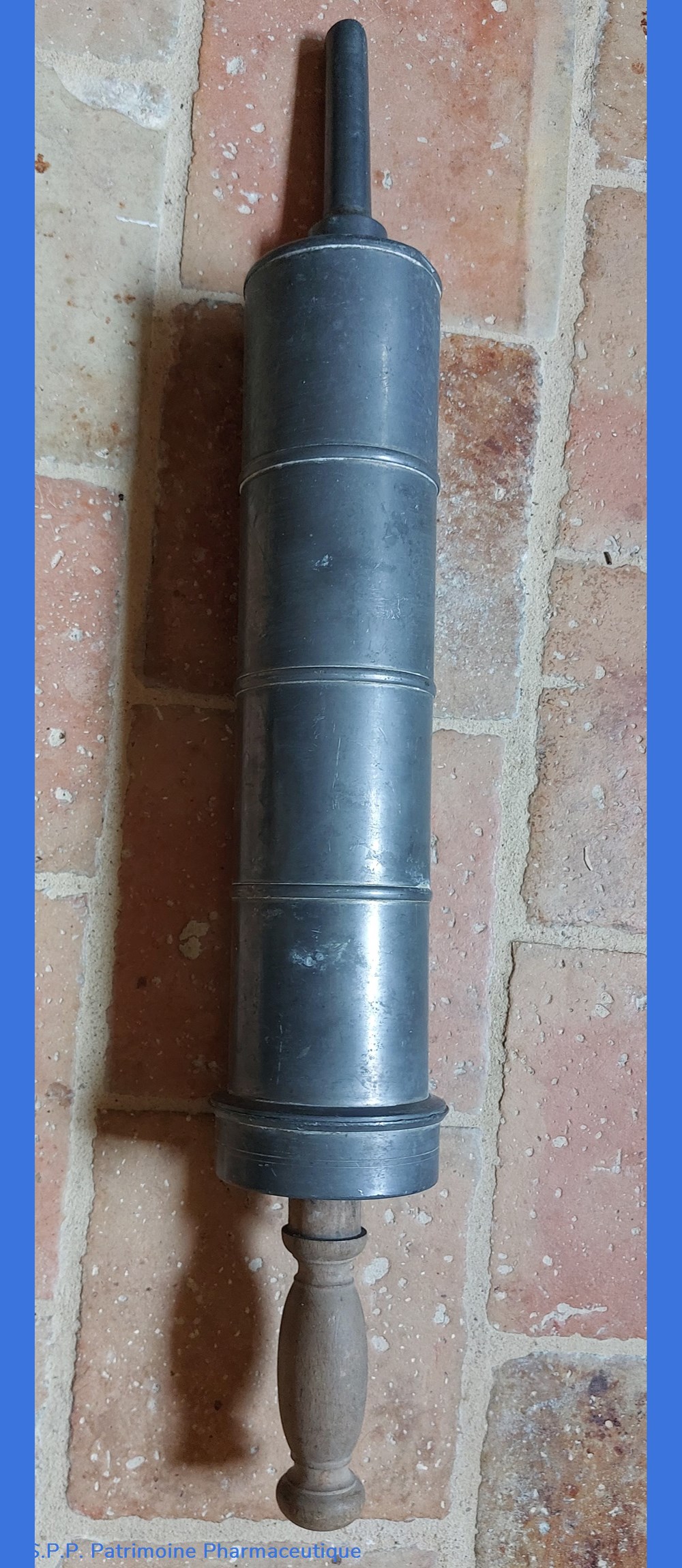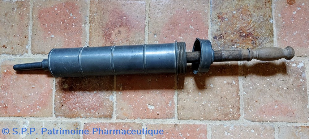 Seringue à clystère grand format longueur 58 cm en mauvais état. Extrémité démontée et cylindre percé en partie haute.