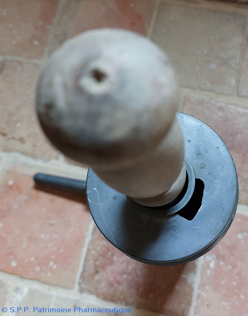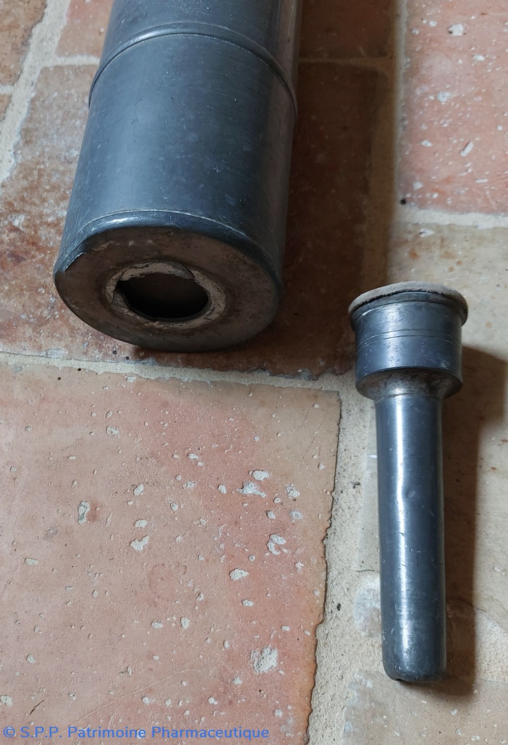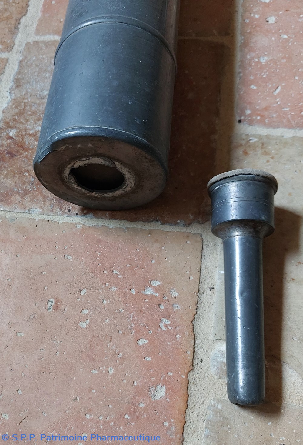 Seringue à clystère grand format longueur 58 cm en mauvais état. Extrémité démontée et cylindre percé en partie haute.