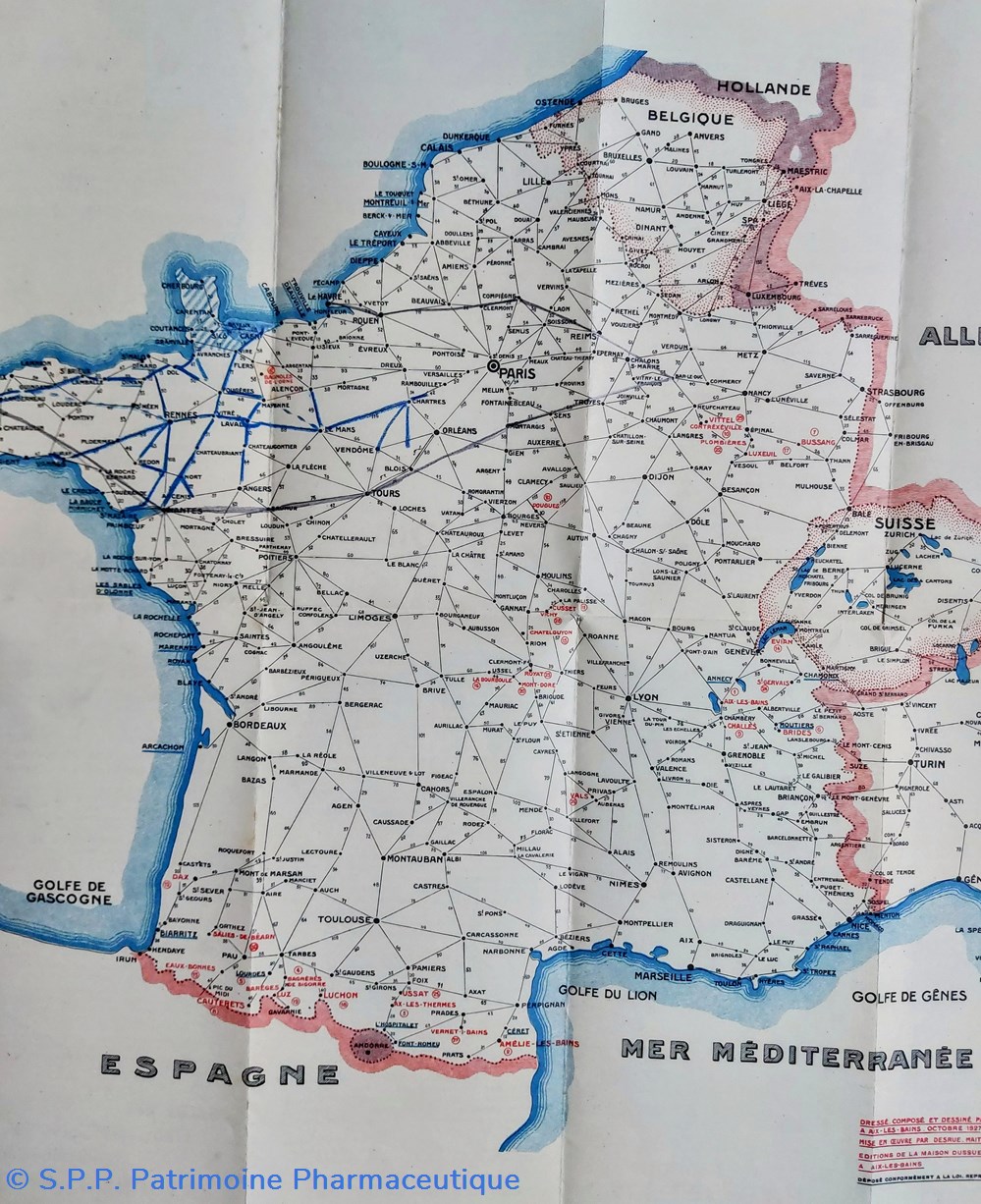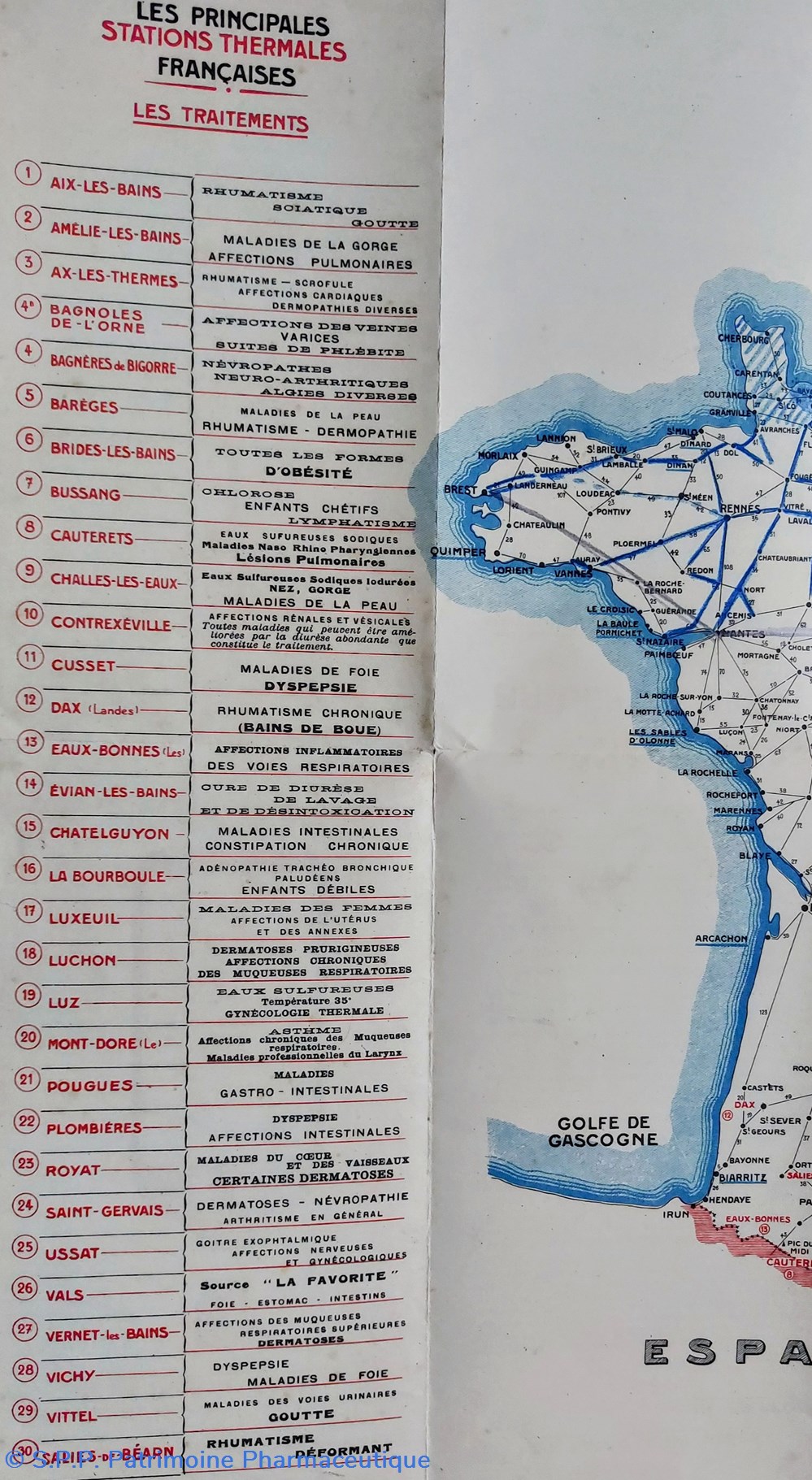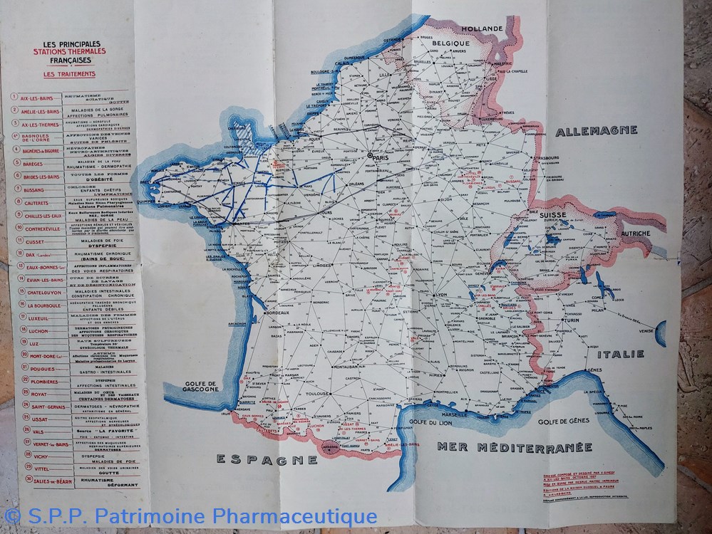 Dépliant listant les Principales STATIONS THERMALES FRANÇAISES et la carte de France pour les situer.