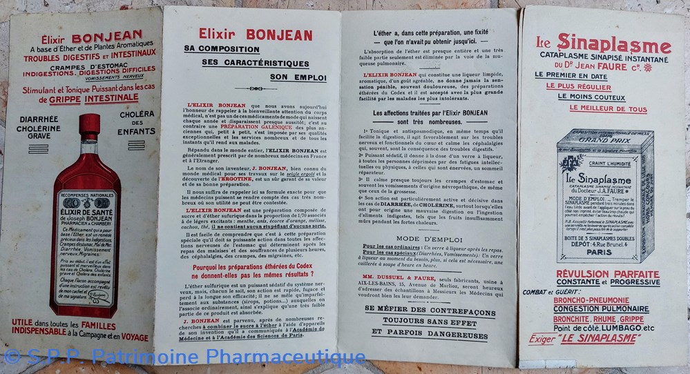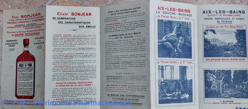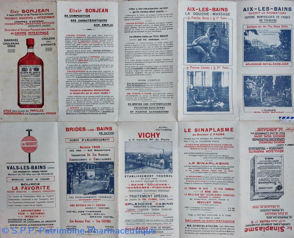Dépliant publicitaire mentionnant quelques stations THERMALES ( Vals les Bains, Brides les bains, Aix les bains, Vichy, et promouvant L'ÉLIXIR BONJEAN ( troubles digestifs et intestinaux) , et LE SINAPLASME ( cataplasmes)