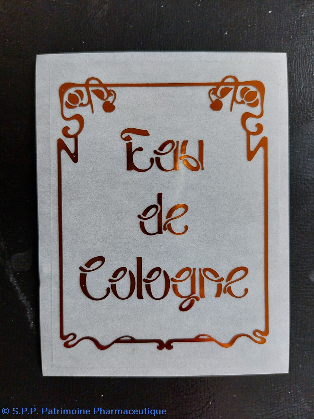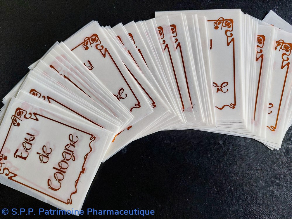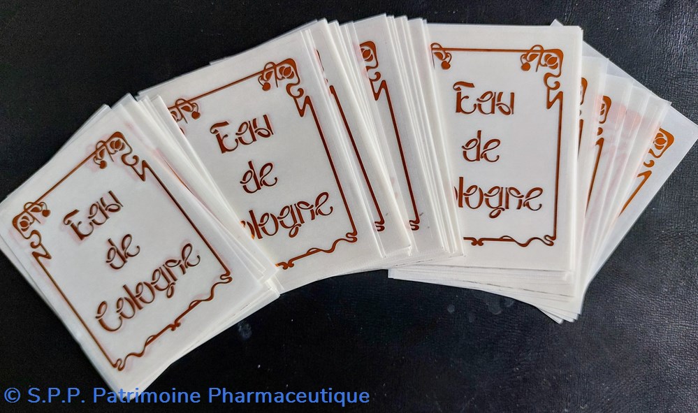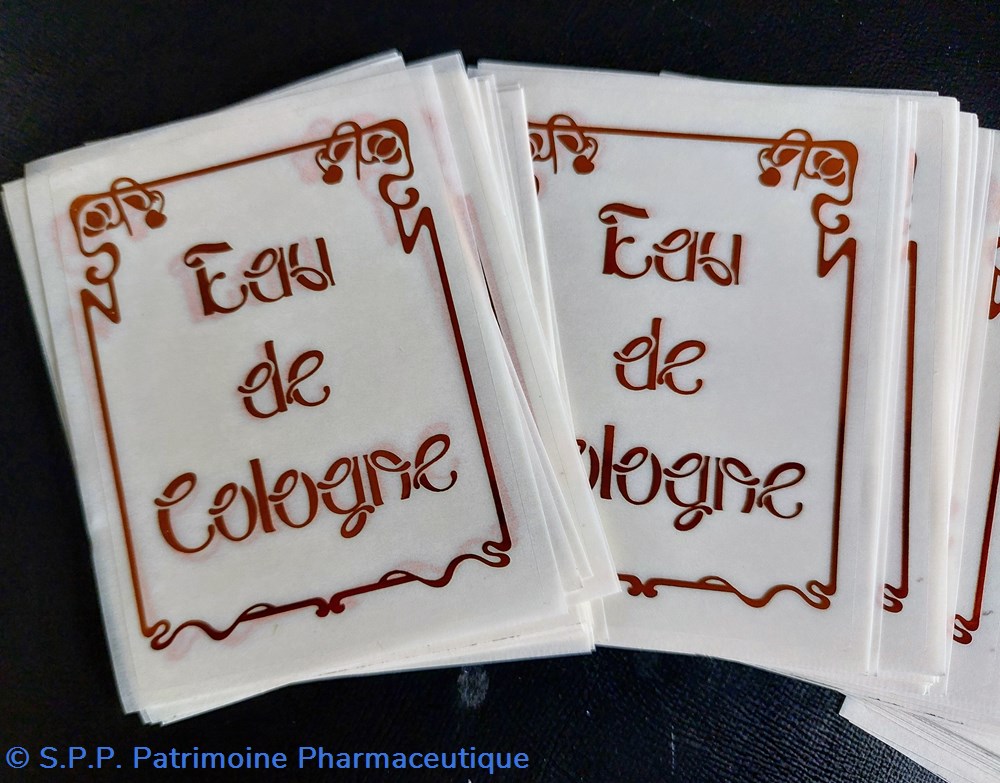 Étiquettes "Eau de Cologne" 8.5 * 6.5 cm fond blanc écriture or.